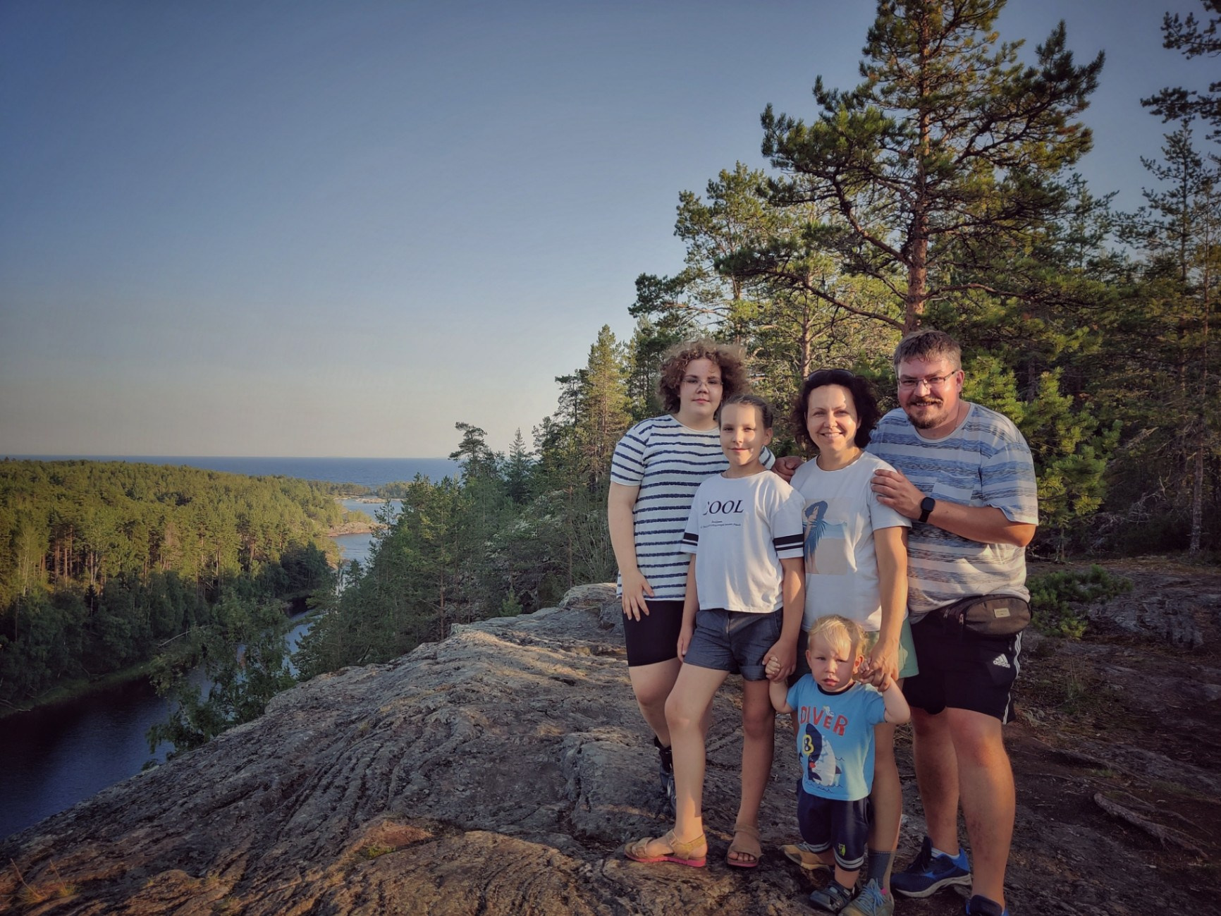 Тропа привела нас на вершину горы Айно. Отсюда открывался живописный вид на Ладожское озеро во всей его красе: бескрайняя вода, острова вдали, лёгкая дымка над горизонтом.